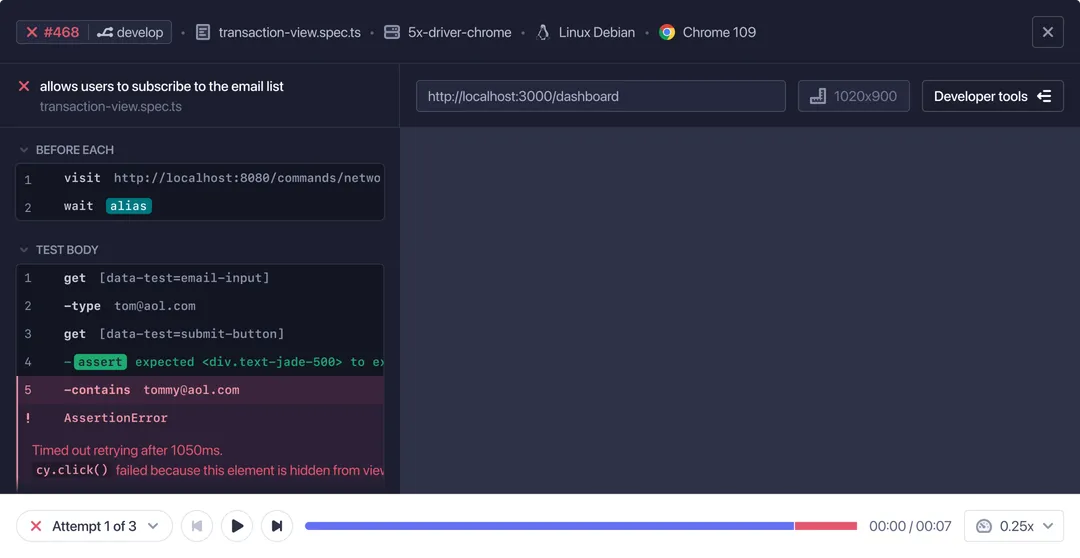 Reach new levels of visibility into why your tests failed in CI. Instantly understand test intent and what went wrong with AI powered summaries. Rewind time with Test Replay to directly inspect the DOM, network events, and console logs exactly as they ran in CI.