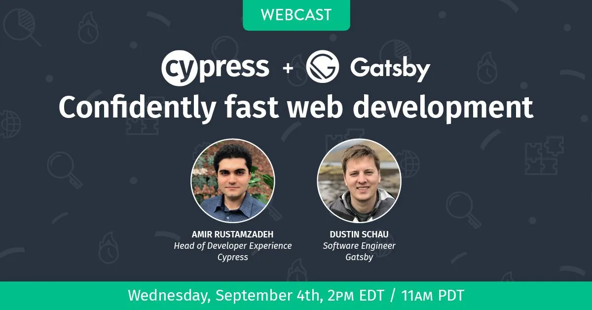 Join Amir Rustamzadeh, Head of Developer Experience at Cypress.io, and Dustin Schau, Software Engineer at Gatsby on Wednesday, September 4th at 2 pm EDT/11 am PDT to see how the Gatsby team leverages Cypress end-to-end (E2E) testing to confidently accept more open-source contributions than ever before. Tune in for real-world discussions and live-coding of tests from scratch to CI. We'll also livestream the broadcast to our YouTube channel.