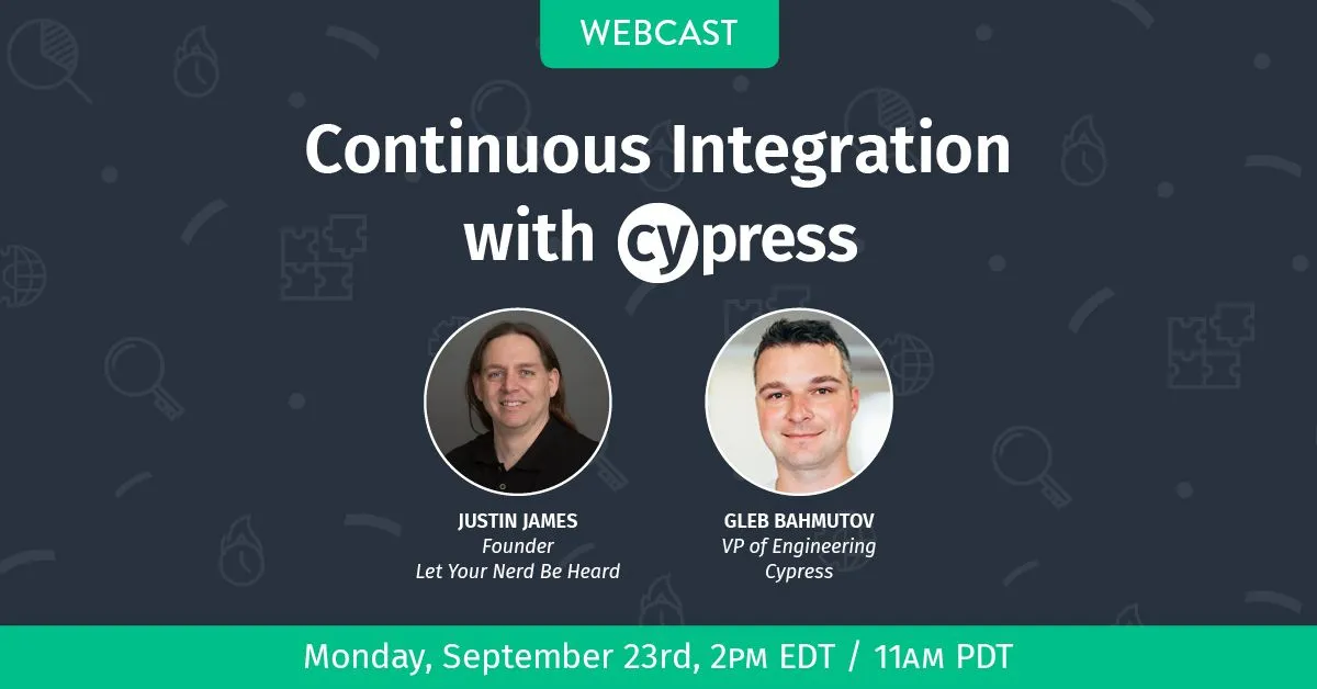 Join us on Monday, September 23rd at 2 pm EDT/11 am PDT to learn how to set up Cypress correctly on a variety of CI providers, from TeamCity to Travis to Circle—hosted by Justin James, Founder of Let Your Nerd be Heard, and Gleb Bahmutov, VP of Engineering at Cypress. They’ll show solutions to the common problems Cypress users experience, and will give tips on how to configure Cypress to run tests against several environments: development, staging, and production.