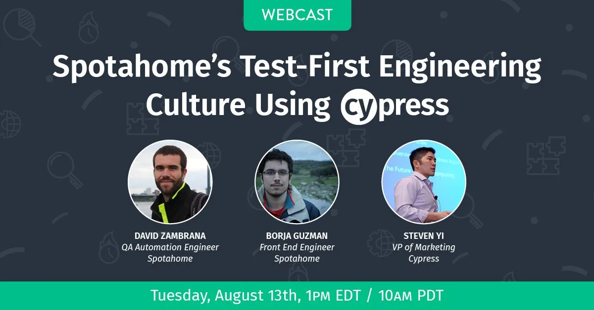 Join us on Tuesday, August 13th at 1 pm EDT/10 am PDT to find out how Spotahome is pursuing engineering excellence and how they created their QA capability by organizing into small agile teams, making testing part of their culture, and utilizing Cypress in over 100 test runs per week.