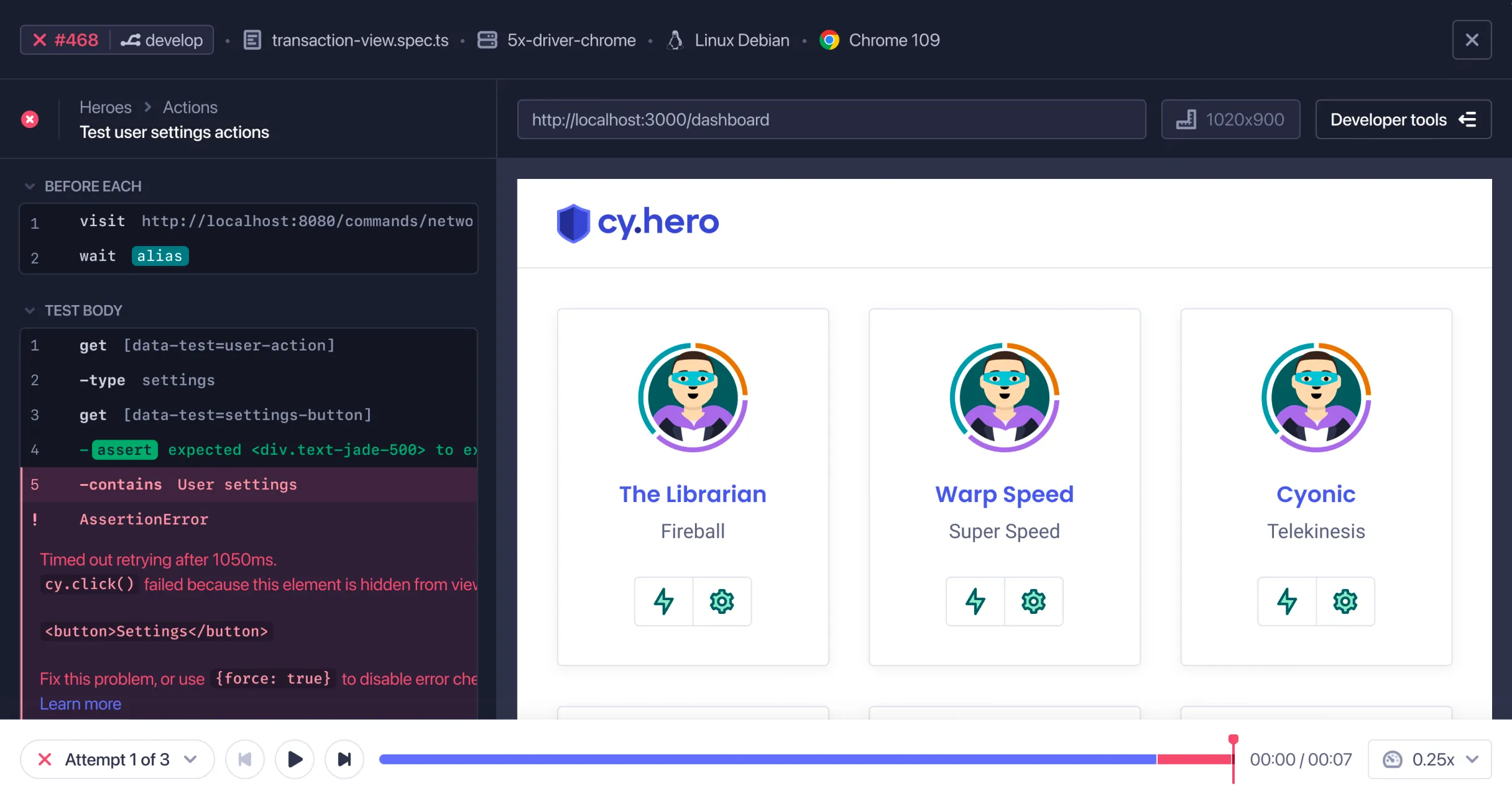 Learn moreAccelerate your deployment times and quickly verify that your latest changes fixed a build in CI by automatically prioritizing the test specs that failed in the previous Cypress run.